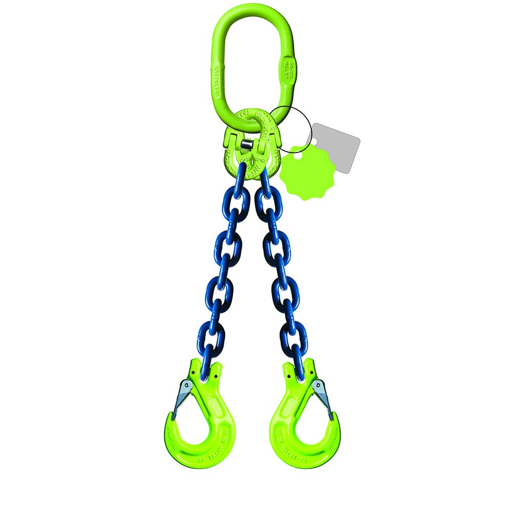 100. klase – 2 kāju ķēdes siksna 13 mm x 1 metrs – Ar knaibles fiksatora āķi – WLL ir balstīta uz 0 – 45°.100. klase – 2 kāju ķēdes siksna 13 mm x 2 metri – Ar knaibles fiksatora āķi – WLL ir balstīta uz 0 – 45°.